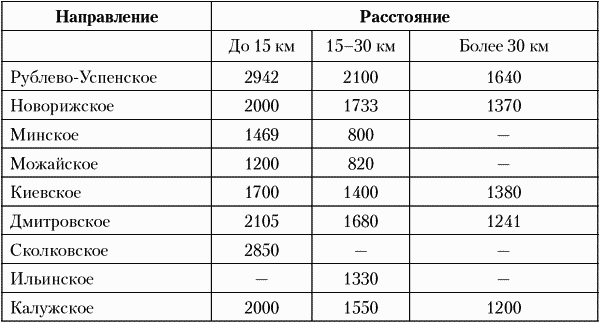 Стоимость подмосковных коттеджей по различным направлениям в 2005 году (долл. за кв. м)[3]