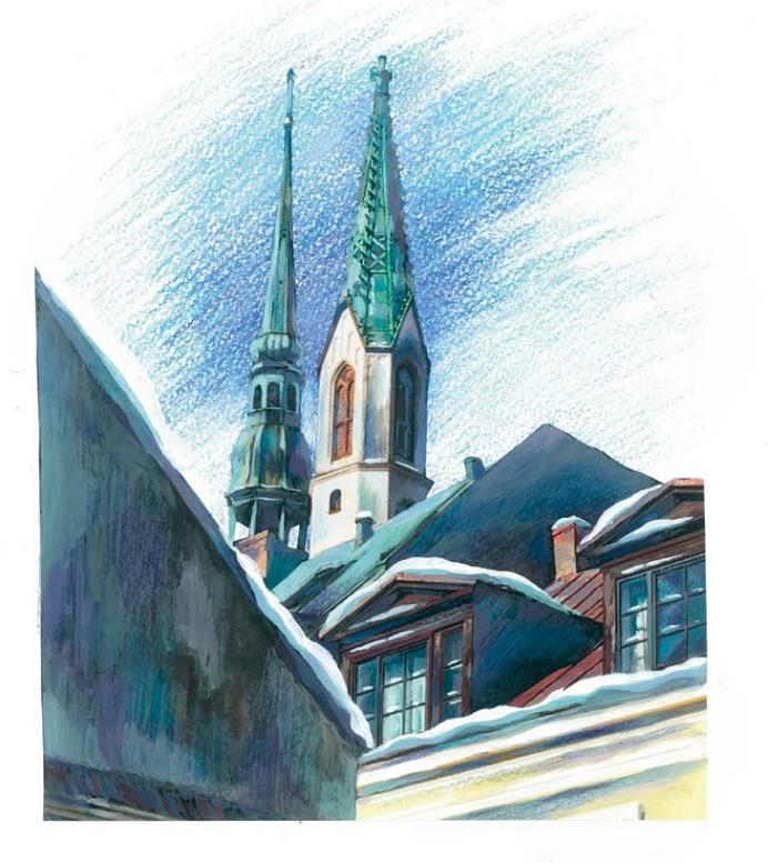 Где ботинок, Максимус?Было холодное, ясное утро 24 декабря и часы на башне собора пробили девять. Золотой петушок на шпиле косился левым глазом на замерзшую реку, а правым, – в комнатку молодого человека по имени Даниэль. Комнатка под самой крышей многоэтажного старинного дома без лифта. Тут холодно зимой, зато летом – жарко, потому что рижские крыши нагреваются от солнца.