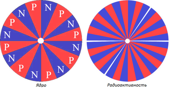 – Например, радиоактивность, скажем так, с «пространственно-механической» точки зрения. Вот смотрите, – Зобин перевернул страницу и ткнул пальцем в другую картинку, – Из-за большего количества нейтронов, в радиоактивном ядре будут участки, где эти нейтральные дольки соседствуют. Понятно, что нейтральные частицы из-за отсутствия взаимодействия между собой прилегают неплотно, создавая «трещины». Эти дефекты и есть радиоактивность. Очевидно, почему, в конце концов, такое ядро развалится.