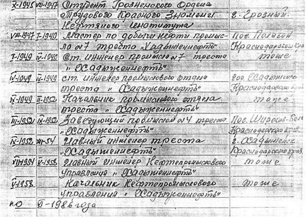 Про Григория Менделеевича местные жители говорили, что это был самый порядочный, работоспособный, честный, интеллигентный начальник, который прошел свой профессиональный путь от мастера по добыче нефти промысла до начальника управления «Хадыженнефть». Сохранилась выписка из его личного листка по учету кадров.