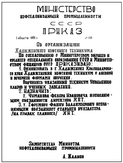 5 августа 1966 г. за подписью заместителя министра А. М. Жданова34 вышел приказ Министерства нефтедобывающей промышленности СССР № 416 «Об организации Хадыженского нефтяного техникума».