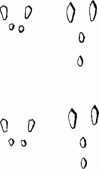 Рис. 2. Расположение отпечатков «четверками». Слева – группа следов в форме трапеции (характерно для белки, сусликов, бурундука, мышей, полевок, иногда зайцев). Отпечатки задних ног впереди передних; те и другие расположены на некотором расстоянии от средней линии следа. Справа – расположение отпечатков, наиболее часто встречающееся на следах зайцев (в форме буквы «Т»). Передние ноги ступают одна позади другой по средней линии следа, задние заносятся далеко вперед. Такое расположение отпечатков бывает при галопе на следах лисиц, волков, копытных зверей и др.