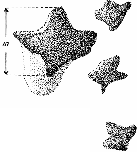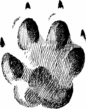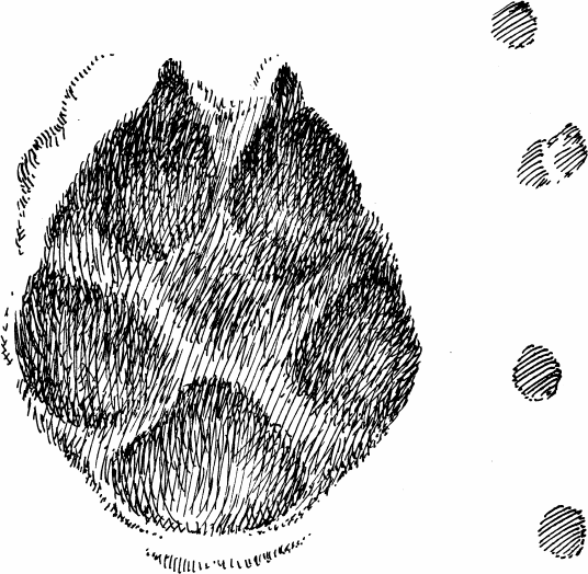 Рис. 4. Отпечаток правой передней лапы среднерусской лисицы на рыхлом мелком снегу. Подошвы ног к зиме густо зарастают шерстью – след получается широкий и расплывчатый (е. в.) Окр. Москвы. Февраль 1945 г. (сравни с рис. 5. и 288).