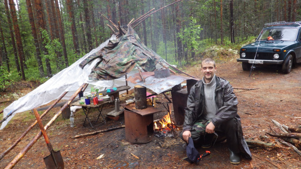 Дабы не сойти с ума придумываем себе занятия. В небольшой перерыв, когда на полчаса сила снизилась до обычного дождика, ну идёт, но не смывает, решил устроить вигвам для укрытия, а то в палатке сидеть не охота. Пошёл по дорожке, нашёл несколько сосновых сушинок, из которых потом связал каркас для вигвама—чума. Сверху укрыл куском полиэтилена, взятым из Петрозаводска, а где не хватило, постелил плащи, выданные в 2009 году.