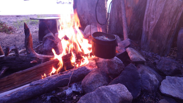 Озеро Симоньярви, красивое, среди соснового леса, от пожара недалеко, как, впрочем, и от деревни Волома. Поэтому сразу же нашли стоянку с костровищем, за дровами сходили на примыкающую старую деляну, где набрали старых серых сосновых суков. Развели костерок и повесили котелок с водой.
