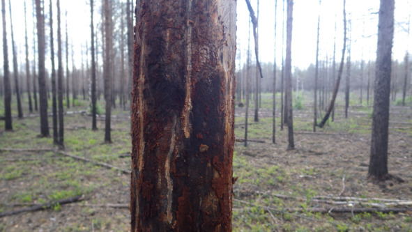 Что произошло в итоге. Древесина от пожара 2010 года сгнила на корню, экономический эффект (оставим для мудрых слов для экономистов, будем правы с точки зрения лесопатолога) равен нулю. Ущерб лесному хозяйству большой. От непринятия мер по своевременному лесопатологическому обследованию, назначения СОМ и своевременной разработки, древесина пропала. Появился очаг стволовых вредителей, который потом стал затухать к 2013 году. И тут в примыкающих выделах появляется новый лесной пожар, более сильный по характеристике, уже гуляет верховой, уже площадь на 10 кварталов, и все стволовые с радостью набрасываются на новую порцию горельника. В 2014 году мы видим тотальное заселение стволовыми (большой сосновый лубоед, усачи и т.д.) Есть тут некоторые моменты про официальную статистику, про которые поговорим позже.