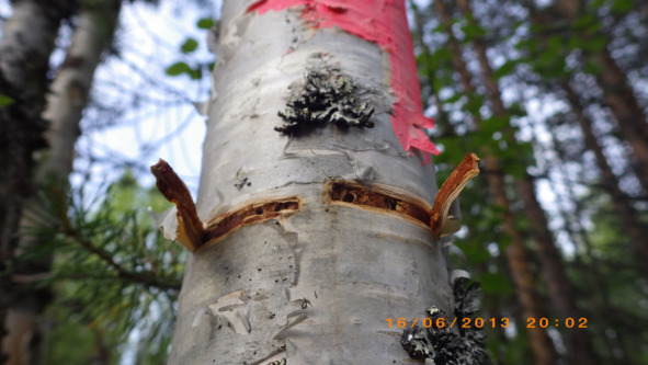 Новое на ППН. Дятел на дополнительной берёзовой модели на ТУ4 долбанул пару раз и кора (береста) лопнула и разошлась раскрутилась в стороны. Данное повреждение в двух местах на дереве.