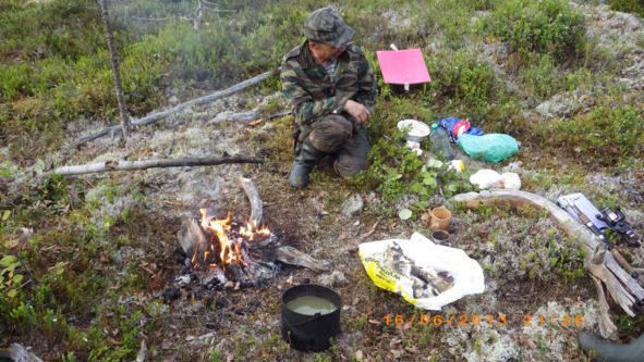Вкусный обед у костра, свежезаваренный лесной чай. Хотя по времени это уже был не обед, а почти ранний ужин. В дневнике зафиксировано время: