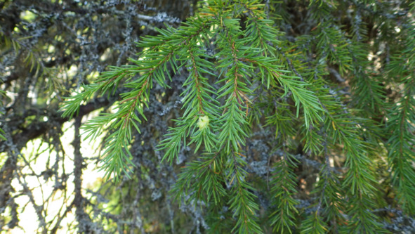 Из прошлых интересных повреждений была морозобоина на стволе ели, которая появилась чуть ли не на моих глазах, и ветровальная модель. В кроне ели есть уснея барбата, местами отрицательно влияет на хвою ветвей, на отдельных экземплярах угнетает вершину. Более сильное отрицательное воздействие видно на севере в районе пос. Пяозерский у ППН 58 и ППН 11. Вот там она растёт в обилии…