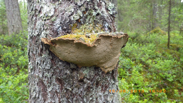 Здесь на модели ели, есть старое большое плодовое тело еловой губки и что главное, если внимательно присмотреться, то выше по стволу видны новые маленькие грибки в местах облома старых сучьев. Чётко видно свежесть за последний год, ведь это дерево я подробно осматривал в прошлом 2012 году. Тогда маленьких ещё не было. А привык внимательно осматривать стволы в местах облома сучьев и других повреждений коры с лесов под Петрозаводском, где находил экземпляры ели, до 6 метров которых росла губка именно по сломам сучьем.