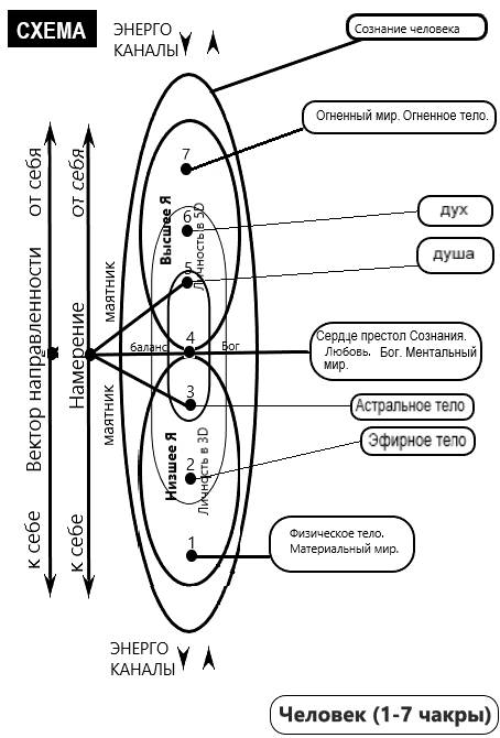 Наше тело запоминает любые взаимодействия с людьми, вещами, атмосферой на физическом и энергетическом уровне. Все это накапливается в памяти тела. Если накоплений будет больше определенного уровня, то это приведет к состоянию напряжения (замешательству). Через восприятие органами зрения, слуха, обоняния, осязания мы формируем личностные программы от Памяти тела. А от Памяти с умозаключениями через опыт прожитых самых разных жизненных обстоятельств, принесших радость, горе, боль, печаль, накладываем Вето или печать, – классно, плохо, хорошо, больно, кайф. Физическое тело реагирует в этой связи бурей гормонов (гормоны радости, страха). На энергетически-эмоциональном плане, в астральном теле включаем переживание от обиды, гнева, страха или желания: хочу двигаться с намерением с вектором направленности на себя, с результатом возвеличивания своей личности (трон, корона). Или с намерением и вектором направленности от себя, через осознание своего несовершенства, через трансформацию, воспитание своей личности. Зов Души (программа), Интуиция, раскрытие Сознания помогают двигаться, действовать в этом направлении. Таким образом, мы сами формируем, воспитываем свою личность в искаженном восприятии истины, через розовые очки, через призму эго, погружаясь в поле, в сферу 3D со своими эгрегорами и закономерностями, со своими правилами игры. Сформировавшийся Интеллект помогает в этом поле, на этом пути действовать успешно, избегать разочарования, неудачи. Удачными, просчитываемыми способами завоевывать территории для действий, с меньшими потерями овладевать благами, не наступая на старые грабли, добиваться целей с намерением поля 3D в нижней триаде (мораль, этика) смотреть в схеме. Интеллект также может успешно работать в расширении, раскрытии сознания в 5D. В формировании логических цепочек в осознание своей личности, а также в работе и в проявлениях космических, божественных законов, в пробуждении Души и в раскрытии верхней триады (схема). А в дальнейшем и в слиянии этих триад через сердце, через Бога, через баланс и равновесие в аспекте Радости, Свободы, в гармонии трансформированных центров, полей человека в Свете Сознания в новой частоте, в новой вибрации.