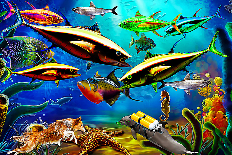 А рыбы там – просто кишмя кишит! Мы с трудом протискивались через несметные косяки, в которых рыбы походили на наших сардин и скумбрию, треску и макрель… Спинки у них, наоборот, светлые, а брюшки тёмные. Наверно, потому, что свет со дна струится, а не сверху, как на Земле. И вообще сами рыбы какие-то светящиеся, более яркие, со всевозможными цветными вкраплениями. А уж дельфины и акулы обрадовались! Только рты раззявили, и рыбы с удовольствием сами залетели, расталкивая друг дружку… Дельфин Набу даже чуть не подавился, не успев вовремя защёлкнуть пасть.