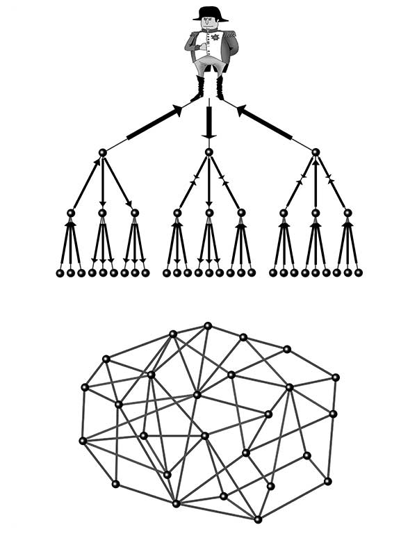 На рисунке схематически показаны иерархическая структура построения системы и сетевая. Отличия видны с одного взгляда!.. Чистая иерархия – это когда во главе один вожак и сверху вниз идут приказы, а снизу вверх – отчёты о выполнении. Сеть – когда нет никакого вожака, а вместо приказов идёт диалог и обмен информацией.