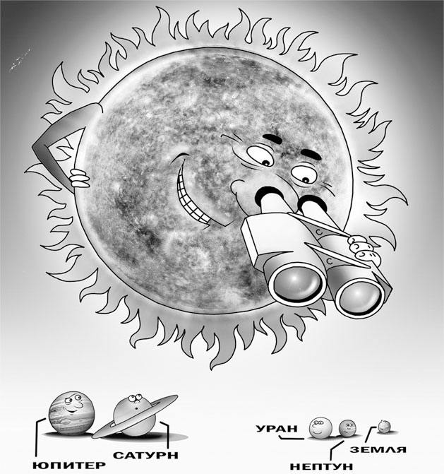 Как видите, наша Земля – третья по счету планета (если считать от Солнца). Она не самая большая и не самая маленькая. Середнячок. То, что вы наблюдаете на рисунке, называется Солнечной системой. Самая большая планета у нас в системе – Юпитер. Самая маленькая – Меркурий. Раньше была еще одна планета – Плутон – самая последняя, расположенная за Нептуном, но в начале века астрономы ее разжаловали из планет за то, что слишком уж маленькая. Недостойна оказалась носить звание планеты, хотя по-прежнему вращается вокруг Солнца и никуда, как вы понимаете, не делась. Просто звание потеряла.