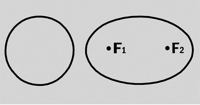 Круг (слева) и эллипс (справа). Все планеты вращаются вокруг Солнца по эллипсам. Латинскими буквами F показаны два фокуса эллипса. О них – в тексте.