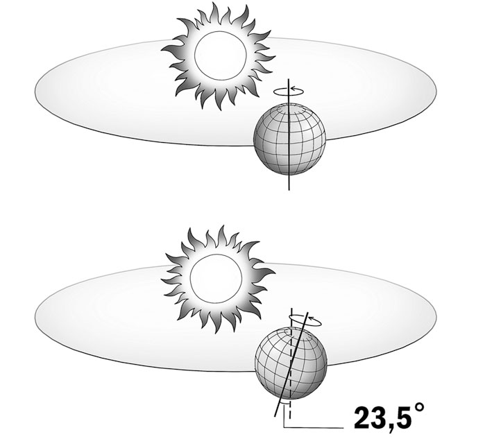 Дело в том, что Земля вращается «криво» – завалившись на бочок. Плоскость, в которой наша планета крутится вокруг Солнца, называется плоскостью эклиптики. Так вот, ось вращения Земли не перпендикулярна плоскости эклиптики. Она завалена на 23,5 градуса.
