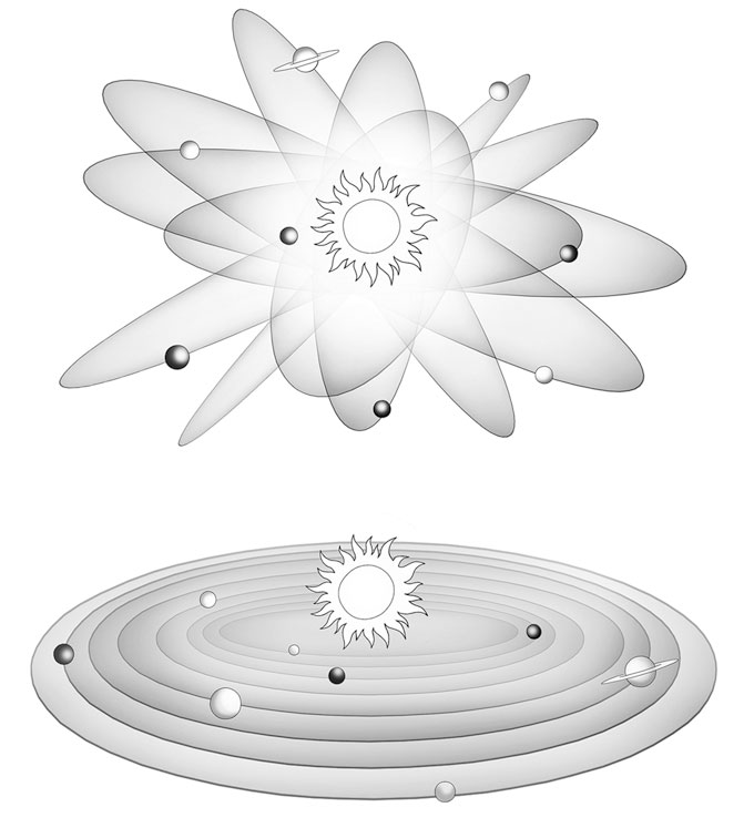 Планеты, наверное, могли бы вращаться вокруг Солнца так, как показано на первом рисунке. Но на самом деле они вращаются как на втором – в одной плоскости, называемой плоскостью эклиптики.