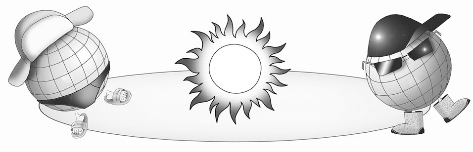 Из рисунка все ясно и без объяснений: повернулась Земля к Солнцу макушкой, значит, больше обогревается макушка, там лето. А если попку подставила, значит, на попке лето!