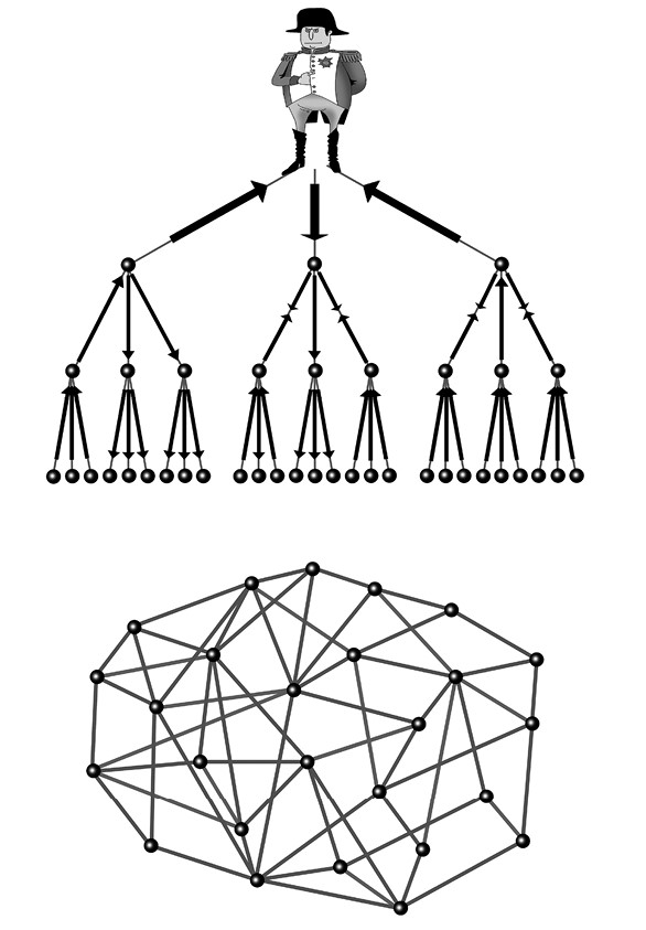 На рисунке схематически показаны иерархическая структура построения системы и сетевая. Отличия видны с одного взгляда!.. Чистая иерархия – это когда во главе один вожак и сверху вниз идут приказы, а снизу вверх – отчёты о выполнении. Сеть – когда нет никакого вожака, а вместо приказов идёт диалог и обмен информацией.