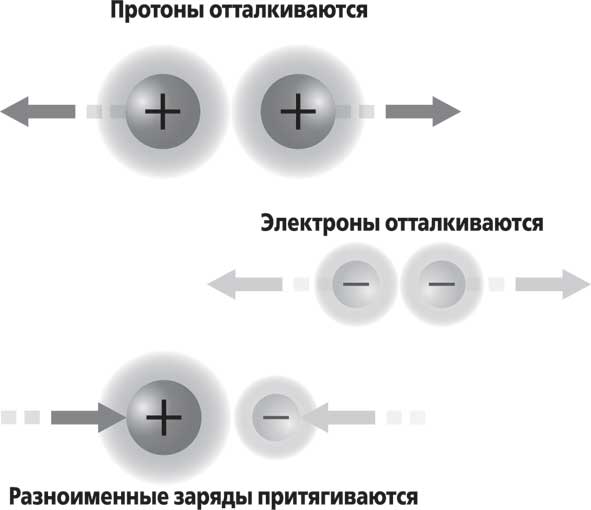 Электрон является носителем отрицательного заряда, а протон – положительного. Разноименные заряды притягиваются друг к другу, одноименные отталкиваются. Это прекрасно видно на рисунке.