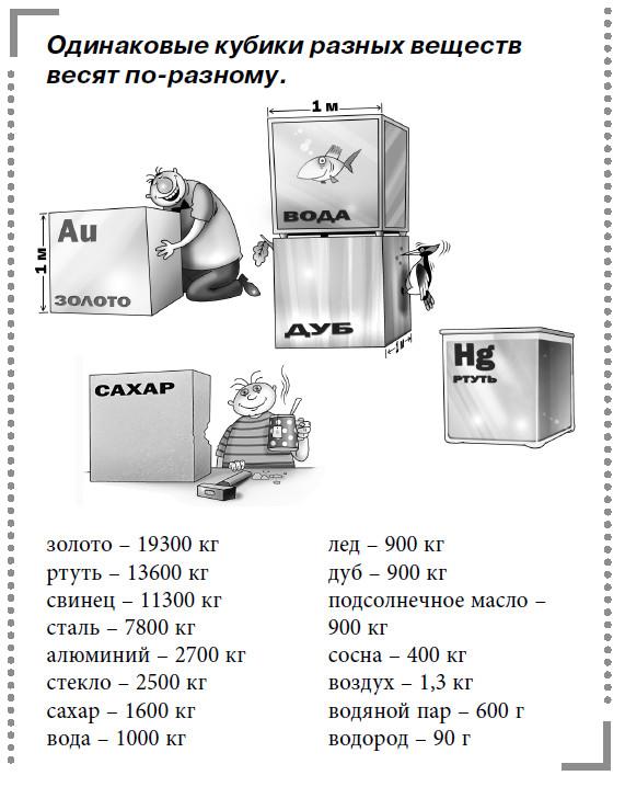 Результат взвешивания покажет, что золотой кубик примерно в 20 раз тяжелее ледяного. 20 ледяных кубиков уравновесили бы на весах один золотой. Потому что золото плотнее. Физики говорят так: у золота выше плотность. Плотность – это количество вещества в одном объеме – например, в одном стакане, кубическом сантиметре или одном кубическом метре. Один кубический метр воды весит одну тонну, а кубометр золота чуть ли не 20 тонн. Не всякий поднимет!