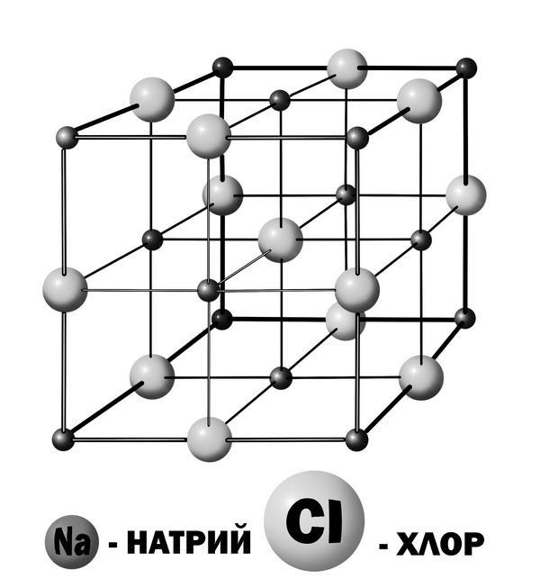 Как устроен кристаллик хлорида натрия? Вот он, на рисунке, посмотрите. Белые шарики – это атомы хлора, а серые – атомы натрия.
