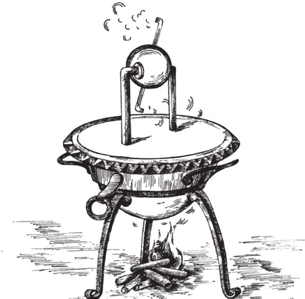 Древняя паровая машина Герона. В чан заливалась вода, под ним разводился огонь, пар поступал по трубкам в шар и вырывался из Г-образных трубок, раскручивая его к веселью наблюдателей