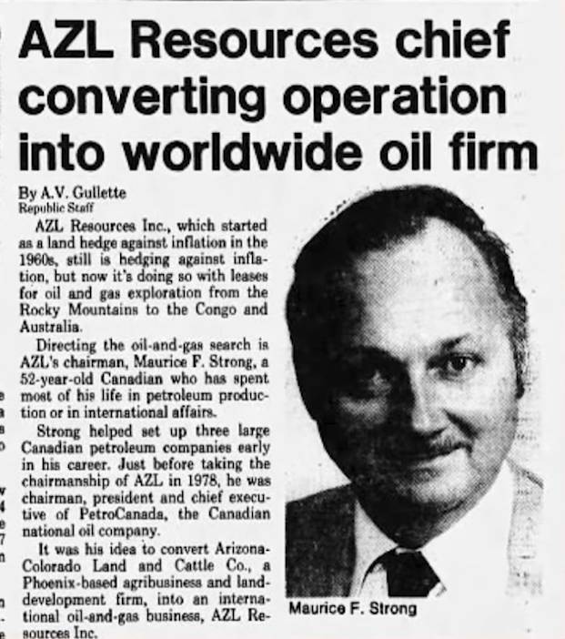 1981 год, судебное дело против некой компании AZL Resources, которая занималась продажей нефти в Денвере, штат Колорадо. Руководство компании обвиняли в искусственном завышении цен на акции компании перед слиянием. Знакомьтесь, руководитель компании AZL Resources – Морис Стронг.