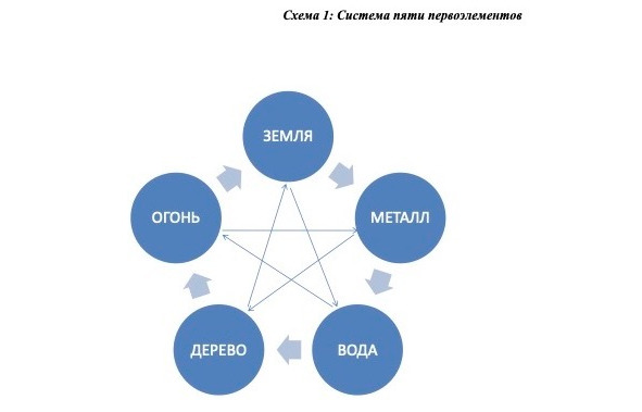 Удобную модель эмоциональной структуры личности дает древневосточное учение о пяти первоэлементах. Согласно ему, любой объект, существующий в природе, содержит в себе элементы пяти основных стихий, между которыми распределяются все его признаки, внешние и внутренние проявления, особенности. В число «классических» пяти первоэлементов входят Дерево, Огонь, Земля, Металл и Вода, причем именно в такой последовательности. Между перечисленными стихиями существуют особые взаимоотношения и причинно-следственные связи, позволяющие им всегда находиться в динамическом равновесии (см. схему 1). Взаимосвязь элементов может выражаться в одном из двух проявлений – усилении (порождении) или подавлении. Направленность усиливающих взаимосвязей обозначена на схеме внешними стрелками, направленность подавляющих воздействий – внутренними. В итоге взаимопорождения и взаимоподавления стихий, их воздействия взаимно нейтрализуются, и это ведет к гармонии. Гармония в этой модели воспринимается не статично, а в постоянной динамике.