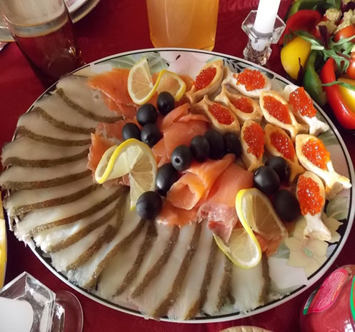 Собственно мясного было немного. Зато достаточно было прочих нарезок и различных салатов, среди которых выделялся новое блюдо из морепродуктов.