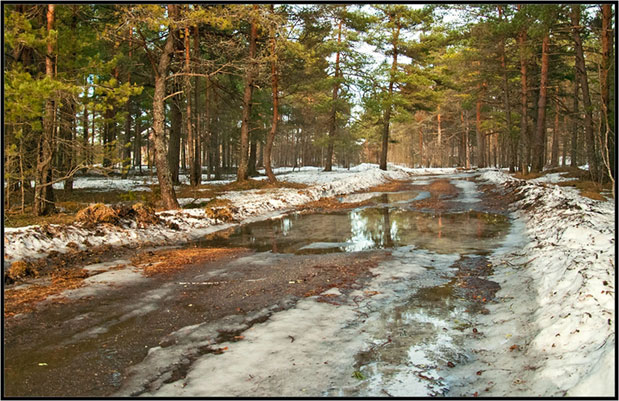 Солнце ярко топит талые снега,И весну торопит очищать луга.Солнце припекает всё сильней, сильней,И весну торопит всё быстрей, быстрей.Крепконосый дятел, – слышно вдалеке, –Вешний день отметил дробью на коре.Из проталин вылезла первая трава.Бледно-голубая неба синева.И стволы деревьев, в луже отразясь,Тихо присмирели, словно затаясь.Воздух сырой, влажный, свежий и хмельной.Солнца луч отважный, яркий, золотой.И в ложбинках леса, в чаще у дорог,Снег лежит последний, как зимы порог.Наполняя лужи, ручеёк бежит.И от испарений в них туман лежит.Горизонт в туманной… дымке, вдалеке.По шоссе шагаю с сумкой налегке.Ровная дорога вдаль меня манит.Солнце с ней играет, лужи серебрит.Первая декада, – то весны разгар.Первый появился солнечный загар.Снега не осталось, стало мало луж.Мы с зимой расстались, нету больше стуж.Тёмные проталины везде вокруг стволов.Зазвучали трели птичьих голосов.Их переговоры всюду всем слышны.Голоса пернатых веселы, смешны.Вдоль дороги грязный снег ещё лежит,Рыхлый, безобразный зиму сторожит.Кое-где отхлынула талая вода.На буграх проклюнулась первая трава.Ели в яркой зелени, кронами шурша,Стройные и сонные стоят, чуть не дыша.Чистые и гордые они, как под ружьём,Первым и весенним омытые дождём.