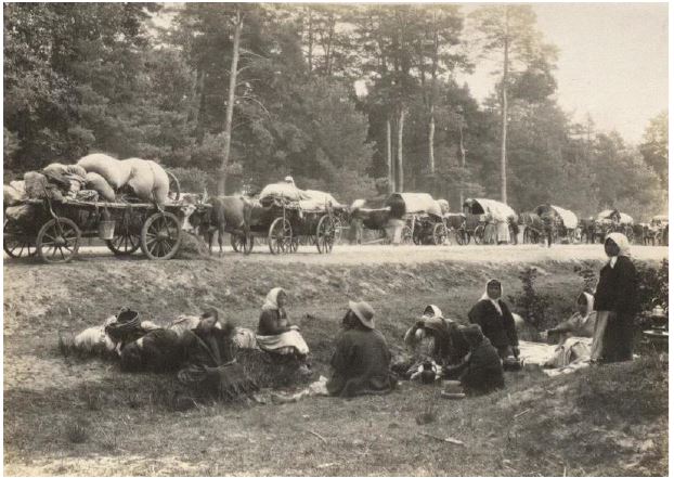 Те беженцы из Западных губерний, которые не смогли воспользоваться железными дорогами, следовали на восток своим гужевым транспортом в основном по Московско-Варшавскому шоссе.