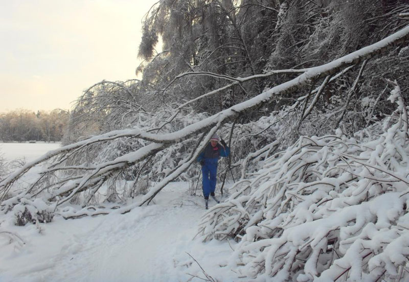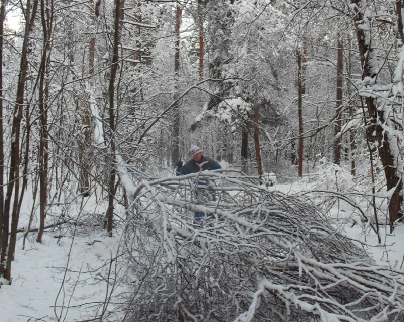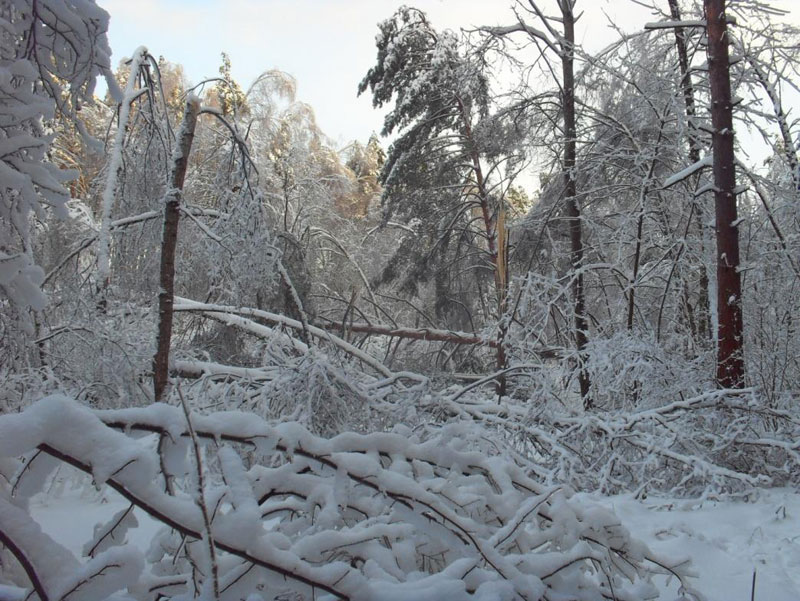 В лесу некоторые деревья были даже выворочены с корнем, но ёлки устояли. Их наклонно вниз растущие ветки сбрасывали с себя излишки снега.