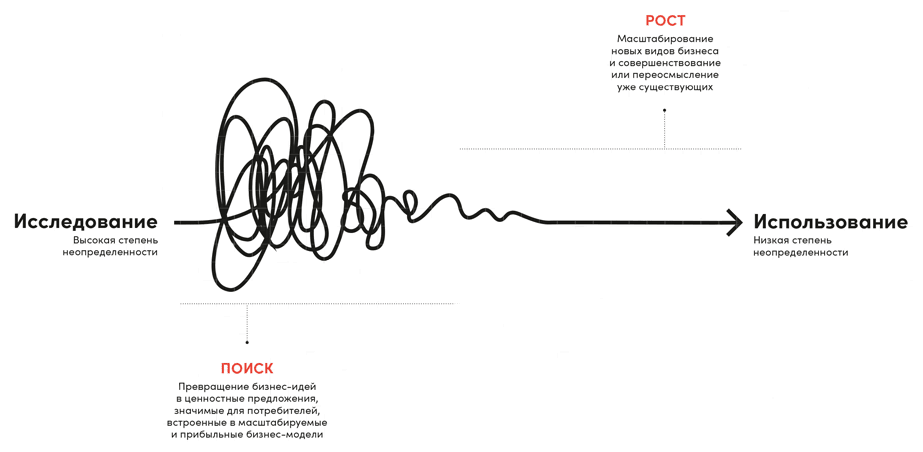 Для тестирования и адаптации бизнес-идеи до момента ее успешной реализации необходим совершенно иной набор навыков, чем для управления бизнесом. Для инноваций и предпринимательства характерна высокая неопределенность. Вы должны выявить закономерности в данных, которые собираете во время тестирования, и преобразовать их в то, что можно прибыльно масштабировать. С опытом вы начинаете лучше справляться с исследованиями, точно так же, как и с управлением.