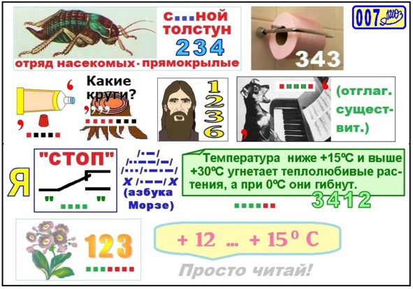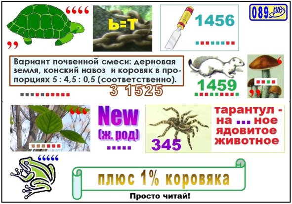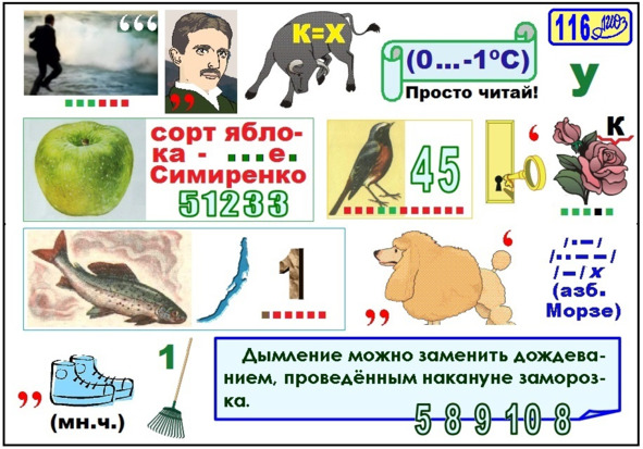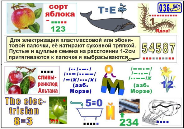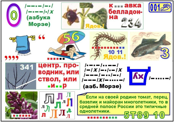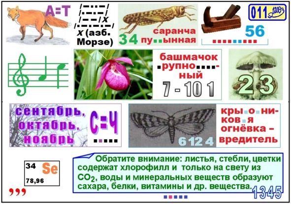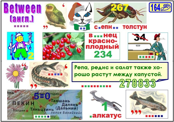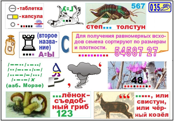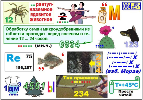 1). Для расширения кругозора любителей, во многих ребусах встречаются картинки с названиями животных-вредителей, грибов и растений. Их названия написаны красным шрифтом, указывающим, что они не читаются. Читаются только некоторые буквы, заменённые точками (не красного цвета). Требуемый порядок расположения этих букв может быть изменён и указан в горизонтальной или вертикальной строке. Для получения дополнительной информации в рисунок ребуса могут быть введены слова: «Яд!» или «Ядов!» (ядовито!), предупреждающие об их ядовитости. Эти слова в ребусе также не читаются.