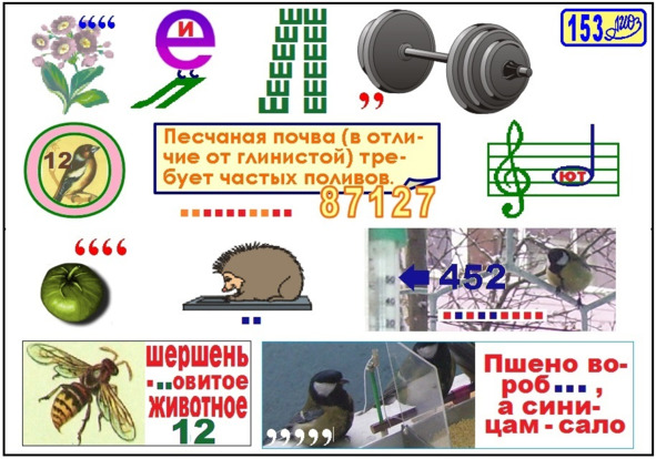 2). Почти каждый ребус содержит дополнительную важную информацию, в декоративной ленте или рамке (с окрашенным фоном), которая также не читается. Читаются только буквы из слов: правило, совет, определение, дополнение, справка, информация, термин, строки, предложение, фраза, пожелание, примечание, наблюдение, в которые «облачена» эта информация. Для облегчения отгадывания слова, под рамками нарисованы точки. Количество точек соответствует количеству букв в загаданном слове. Причём, красные точки соответствуют буквам, которые не читаются.