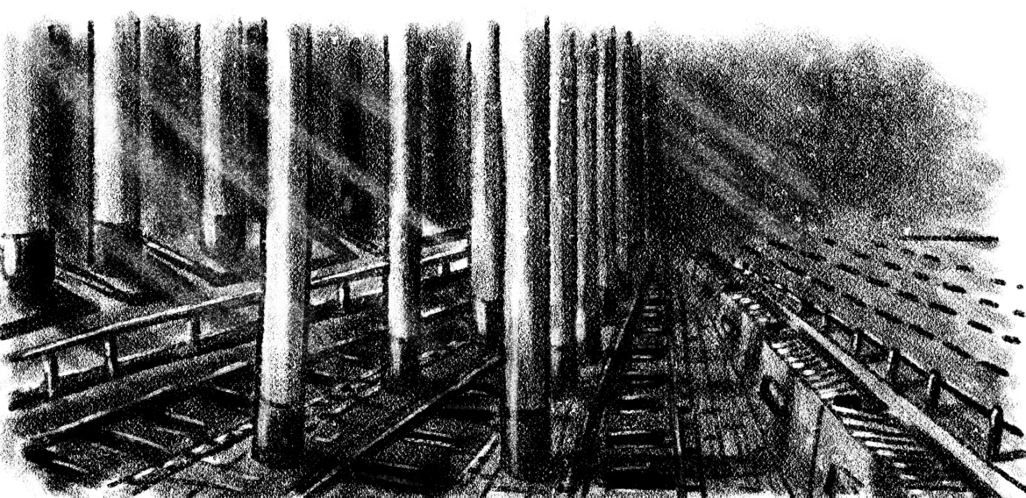Миновав колонны, они подошли к частично металлическому, частично стеклянному барьеру высотой до середины груди. Элинор заглянула за него, встав на носочки и вытянув шею, и увидела внизу несколько глубоких колей с рельсами. Их также разделяли несущие конструкции – еще более монструозные, чем у входа. Далее, отгороженная стеной из одноуровневых построек, параллельно железнодорожным путям шла автомагистраль, по две или три полосы в каждую сторону. За ней с немалым усилием можно было разобрать такое же возвышение с барьером, как то, у которого стояла Элинор, а еще дальше – аналогичные ряды колонн, почти полностью скрывавших противоположную стену.