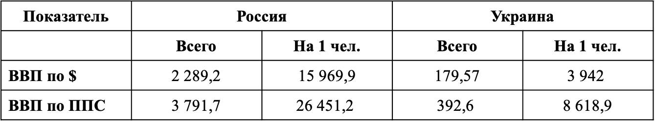 Таблица 1. Данные по ВВП России и Украины в 2013 году, (долл. США)
