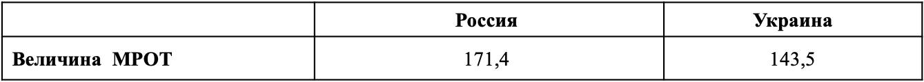 Таблица 2. Данные по величинам МРОТ России и Украины в 2013 году., (долл./мес.)