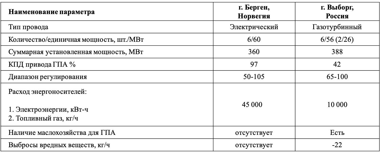 «Рассмотрим эффективность ЭГПА на примере КС компании Statoil в городе Берген и техническое решение, реализованное на КС Портовая ОАО «Газпром» в городе Выборг. Компрессорная станция в городе Бергене обеспечивает компримированние и дальнейшую транспортировку природного газа потребителям с месторождения. В качестве привода ГПА Северного потока используются газотурбинные установки Rolls-Royce. Сравнительная оценка технических характеристик КС Портовая в городе Выборг и КС в городе Берген приведена в табл. 1.