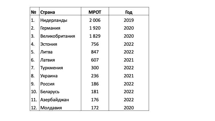 Табл. №1. Данные по МРОТ по группе стран (долл./месяц) [23].