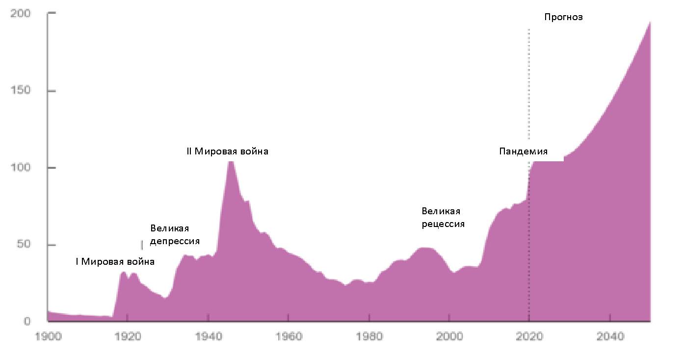 Рис. 3. Государственный долг США в процентном отношении к ВВП с 1900 по 2050 год по состоянию на 31 декабря. [38]