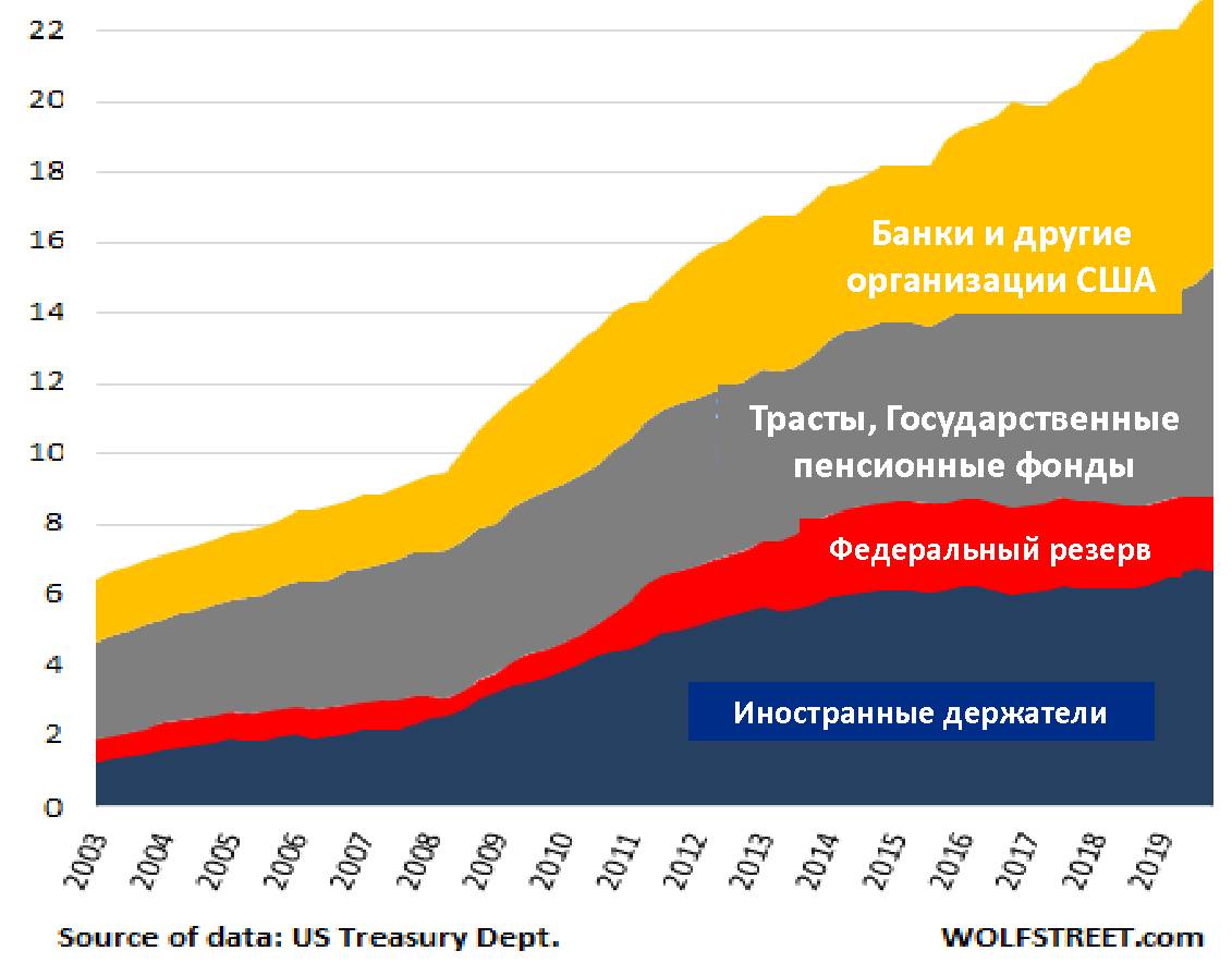 Примечание: Банки, другие американские субъекты – желтым; Фонд социального страхования, американские государственные пенсионные фонды – серым; ФРС – красным; Иностранные держатели – синим.