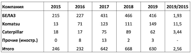 Табл. № 1. Данные поставок карьерных самосвалов грузоподъемностью 90-360 тонн в Россию в 2015 – 2019 годах.