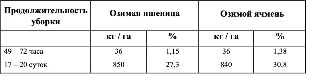 Табл. 2. Данные о потерях зерна в зависимости от продолжительности уборки.