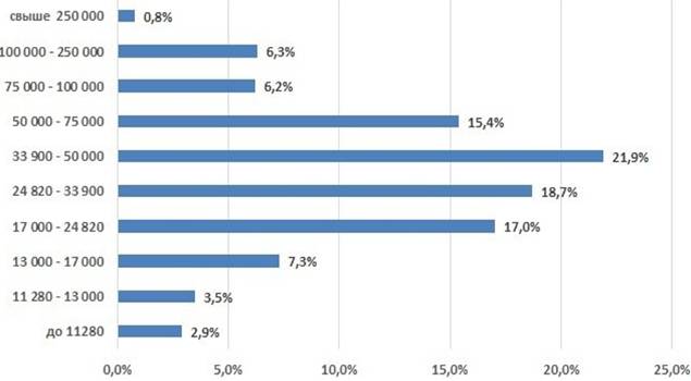Таблица 2. Распределение работников по размеру начисленной заработной платы в России (апрель, 2019г.)