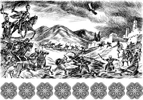 Стрела, пущенная от осаждающих, ударяет в башню и отлетает к ногам царевича Александра. Александр поднимает стрелу