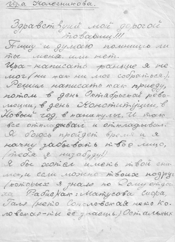 Ира, написать раньше я не мог (никак не мог собраться). Решил написать, как приеду из Дома отдыха, потом в день Октябрьской революции, в день Конституции, в Новый год, в каникулы. И так все откладывал и откладывал. Я боюсь пройдет еще немного времени, и я начну забывать твое лицо (тебя, конечно, не забуду).