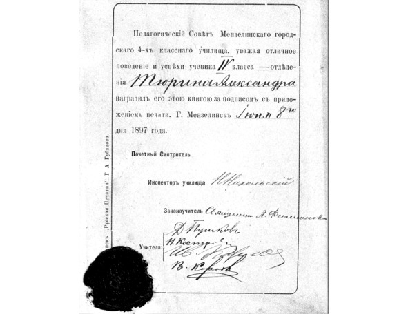Но с моим аттестатом приключилось некоторое недоразумение. Для получения аттестата требовалось представление метрической выписки о рождении. Факт моего рождения и крещения был записан в церкви села Верхние Юшады, находящихся в пяти километрах от Нижнего Тимергана. Мое крещение происходило, однако, дома, а не в церкви. При крещении я был назван по желанию родных Александром, но в книге церковных записей по ошибке священника и его помощника меня записали Иоанном. Естественно, что метрическая запись была выдана не Александру, а Иоанну, можно себе представить мое горе и великое смущение моих родных. Инспектор городского училища Н. П. Никольский был также обескуражен. Виданное ли дело: учился Александр Тюрин, а оказался Иоанном. Аттестата я не получил. Дедушка составил жалобу на действия притча села Верхние Юшады и потребовал исправления ошибочной записи. Оказалось, что жалобу надо подавать в духовную консисторию, находившуюся в Уфе. Жалобу подали, дедушка написал личное письмо одному из членов консистории, но дело сильно затянулось. Решение консистории в благоприятном для меня смысле последовало только через год, в конце 1898 года.