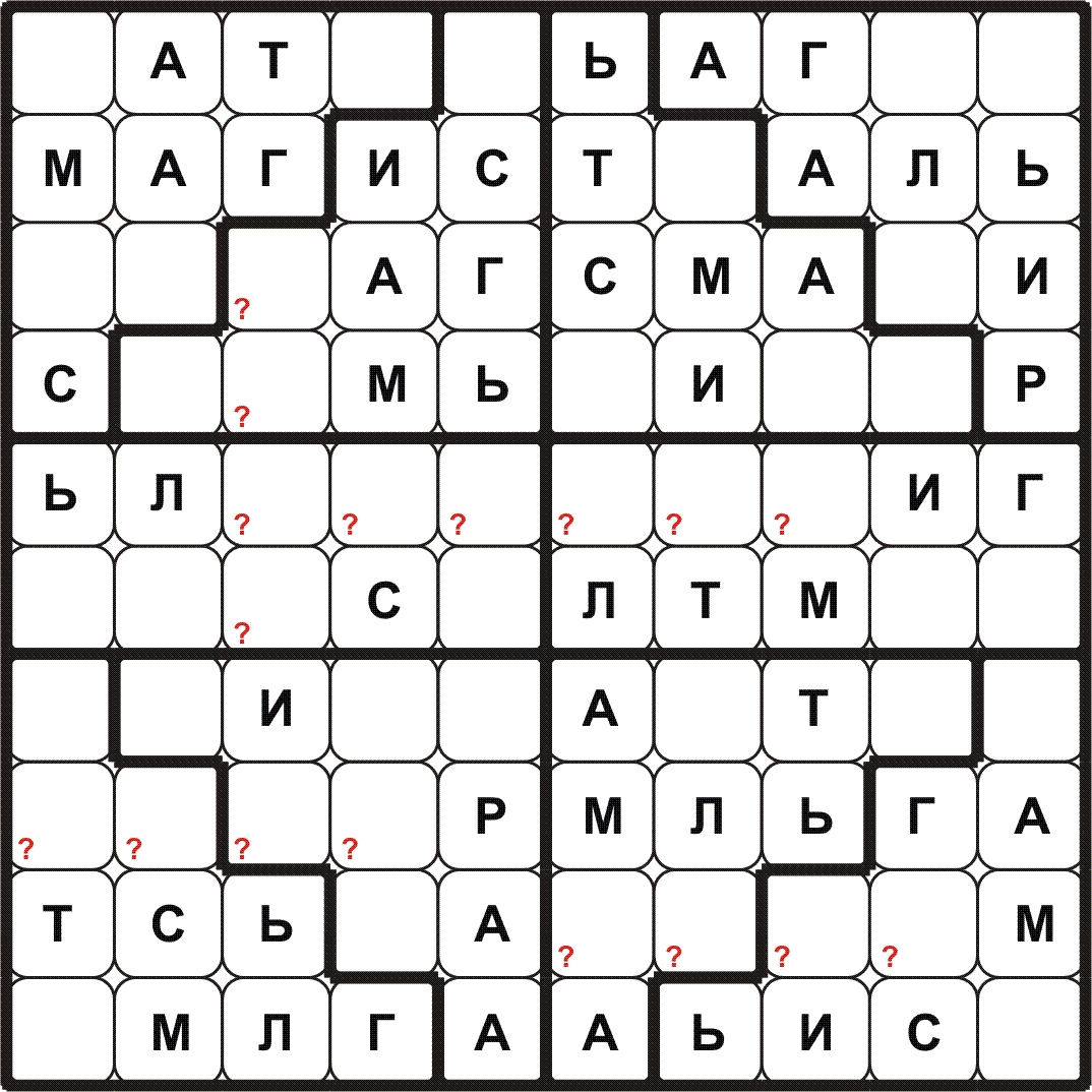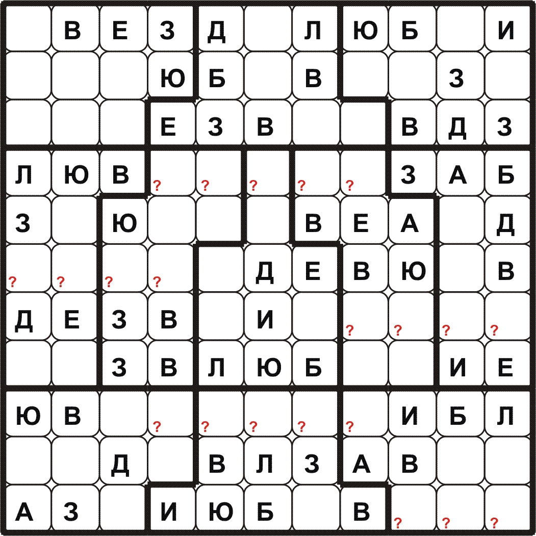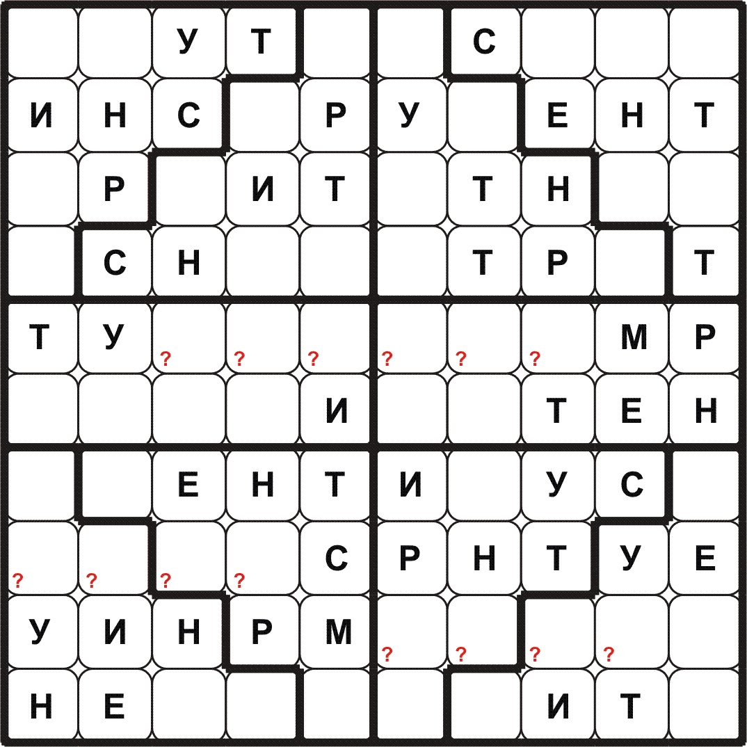 BUDOKU\БУДОКУ – доработанное судоку: нужно разместить все символы заданного слова\фразы в каждой строке, столбце, выделенном блоке и определить контрольные слова в клетках с (?). Путей решения с применением различных способов может быть много.